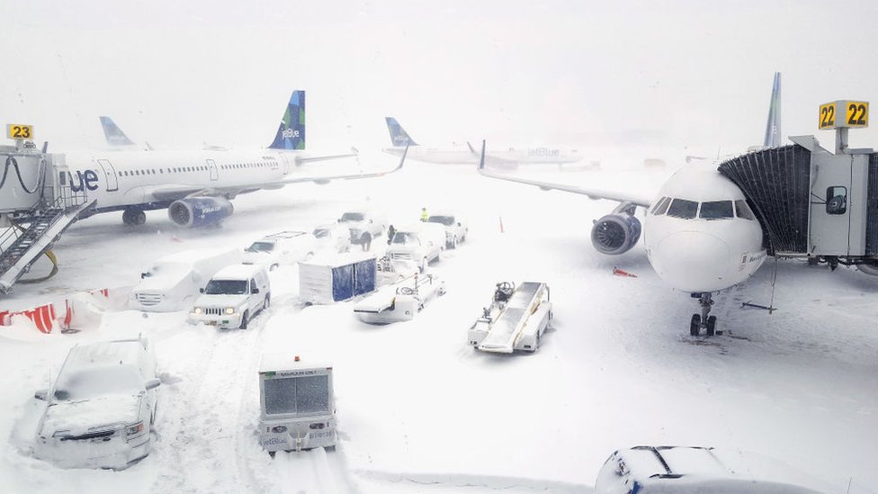 Image caption Sejumlah pesawat di Bandara Internasional John F. Kennedy tertutup salju. Hampir 40.000 penerbangan dibatalkan di seluruh AS.Badai musim dingin telah menyebabkan kekacauan perjalanan di bagian timur laut AS dan disebutkan mengakibatkan 17 kematian.